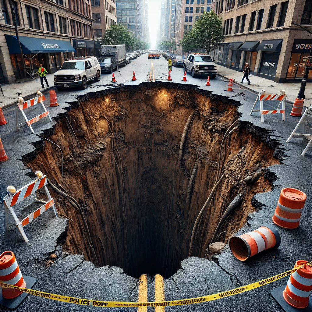 이러한 대규모 함몰은 단순한 지반 침하가 아닌 지하 구조물의 붕괴 또는 대규모 지하 공동(空洞) 형성 가능성을 시사합니다.