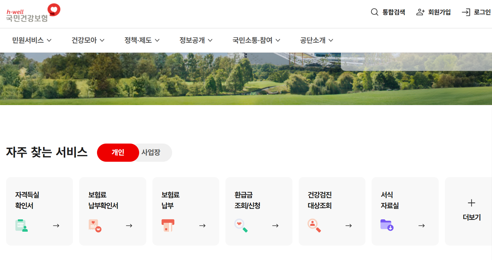 - 국민건강보험공단 홈페이지에 접속합니다.
