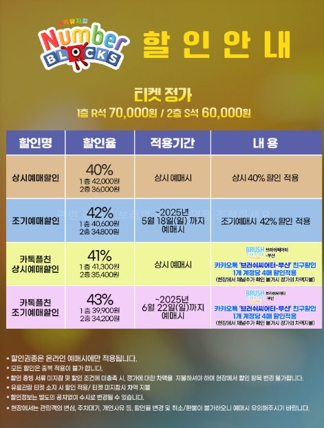아이와 함께하는 특별한 추억을 만들고 싶다면, 〈넘버블록스〉 뮤지컬을 놓치지 마세요! 지금 바로 예매하시고, 즐거운 공연 관람 되시길 바랍니다.