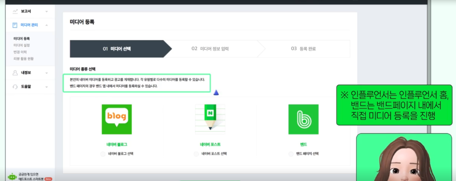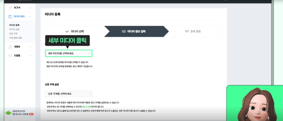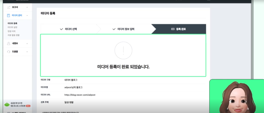 - 애드포스트 관리 페이지에서 '미디어 관리' → '미디어 등록'을 선택합니다.