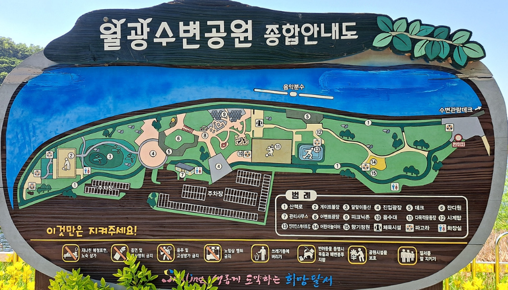 - 주요 시설: 음악분수, 월광교, 장미길, 다목적운동장, 인라인스케이트장, 게이트볼장 등 다양한 편의시설이 마련되어 있습니다.