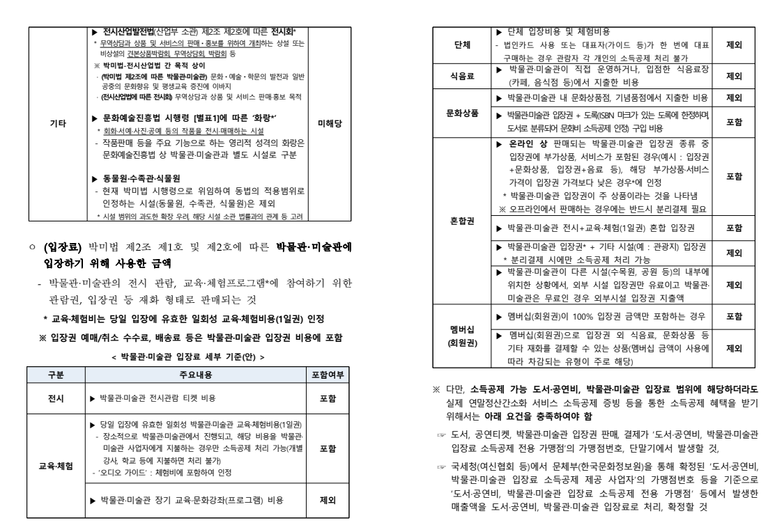 | 박물관·미술관 | 등록된 박물관·미술관 입장권 | 가능 | 음료·기념품·장기 교육비는 불가 |