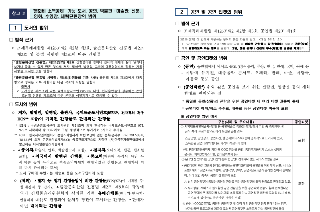 - 도서, 공연, 박물관·미술관 입장권, 영화관람, 신문구독료, 수영장·체육시설 이용료까지 포함됨