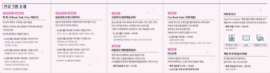 | 16:00~18:00 | 읽은대로 – 부산작가 북토크 | 메인스테이지 | 시민대화형 토크 |