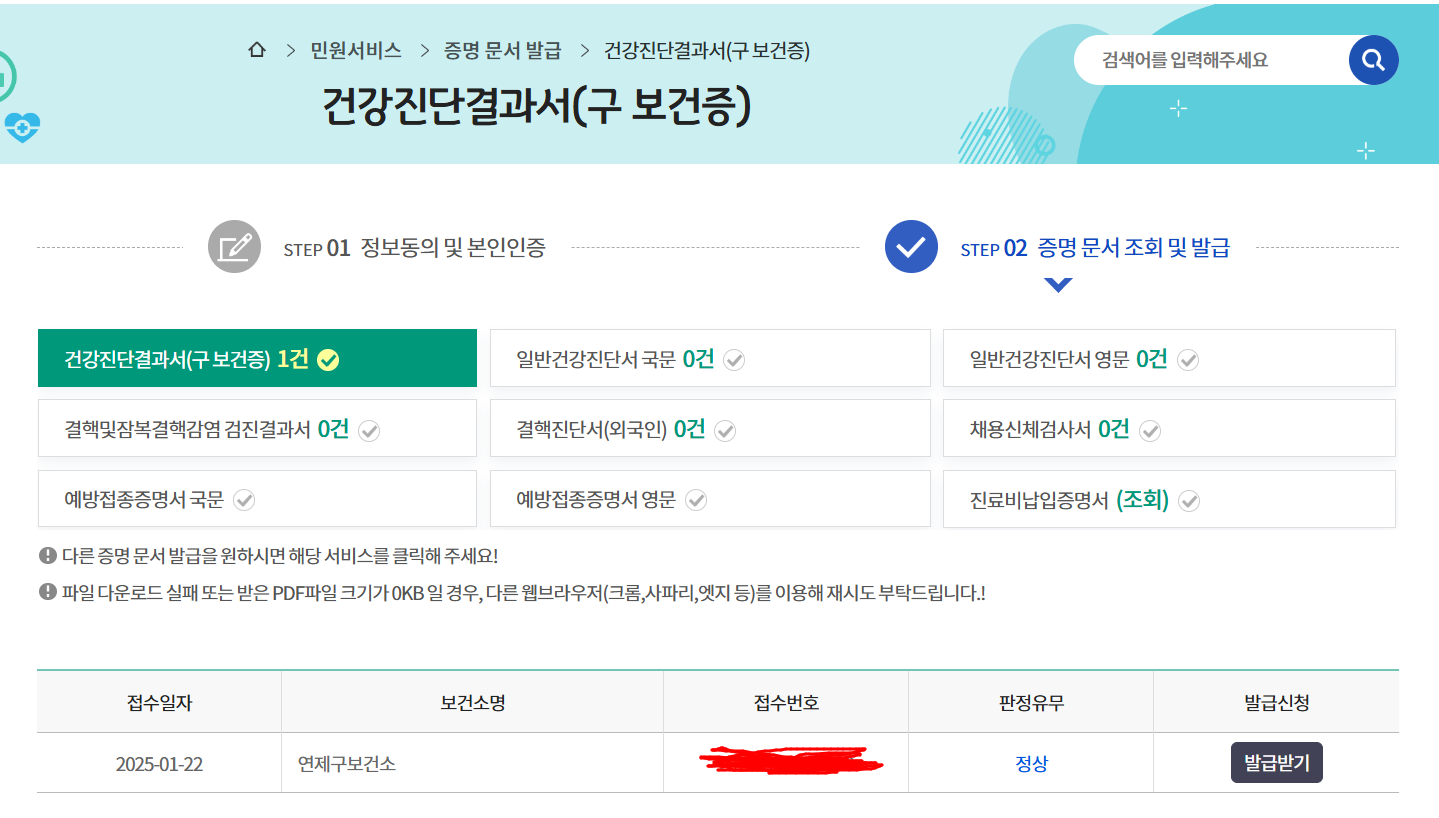 ✔ 인터넷 발급 전, 보건소에서 건강검진을 받은 후 최소 5~7일이 지나야 조회 가능