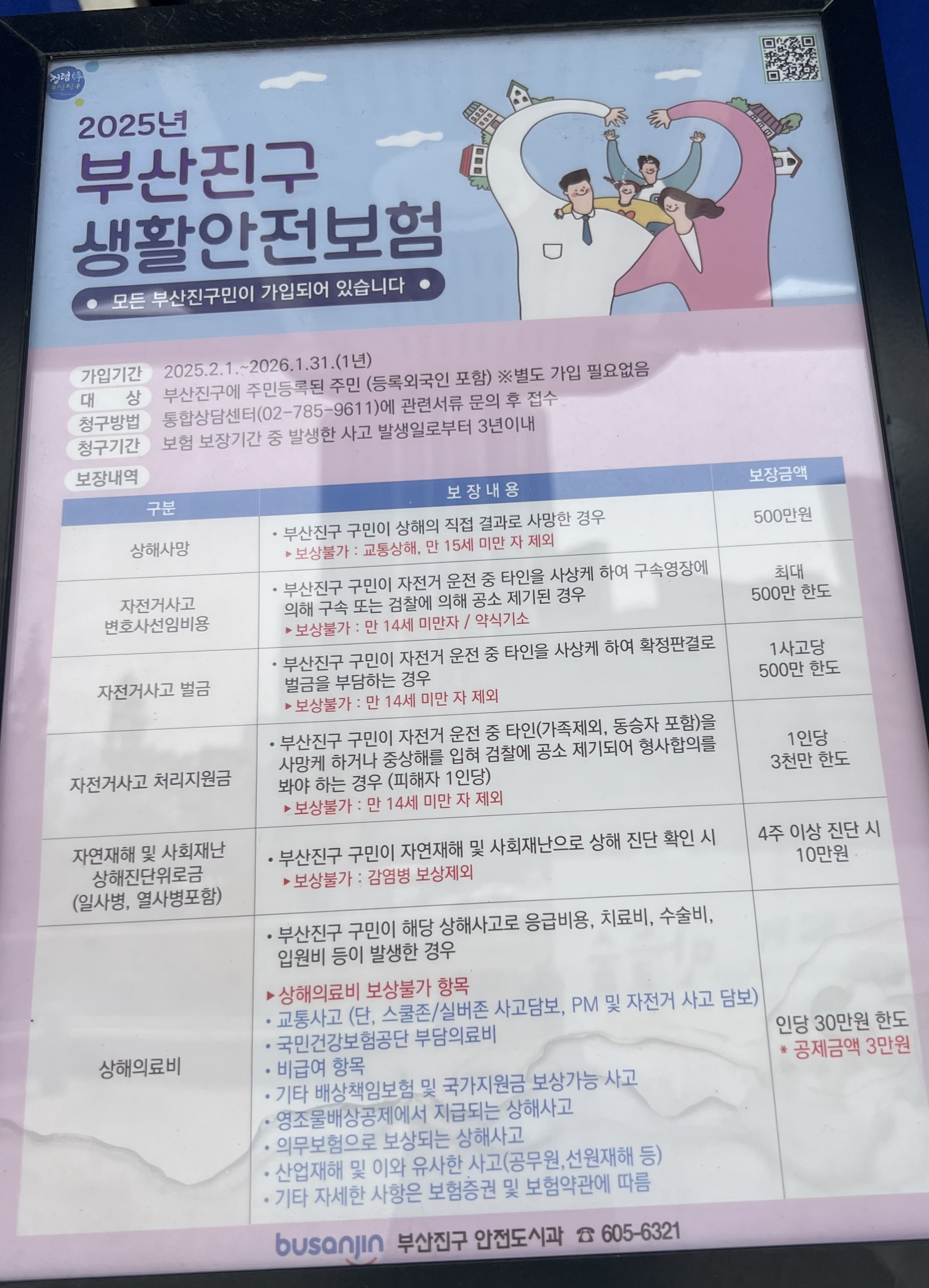 부산진구 생활안전보험은 구민 여러분의 안전한 일상생활을 위한 든든한 지원제도입니다. 예기치 못한 사고에 대비하여, 해당 제도의 내용을 숙지하시고 필요 시 적극 활용하시기 바랍니다.