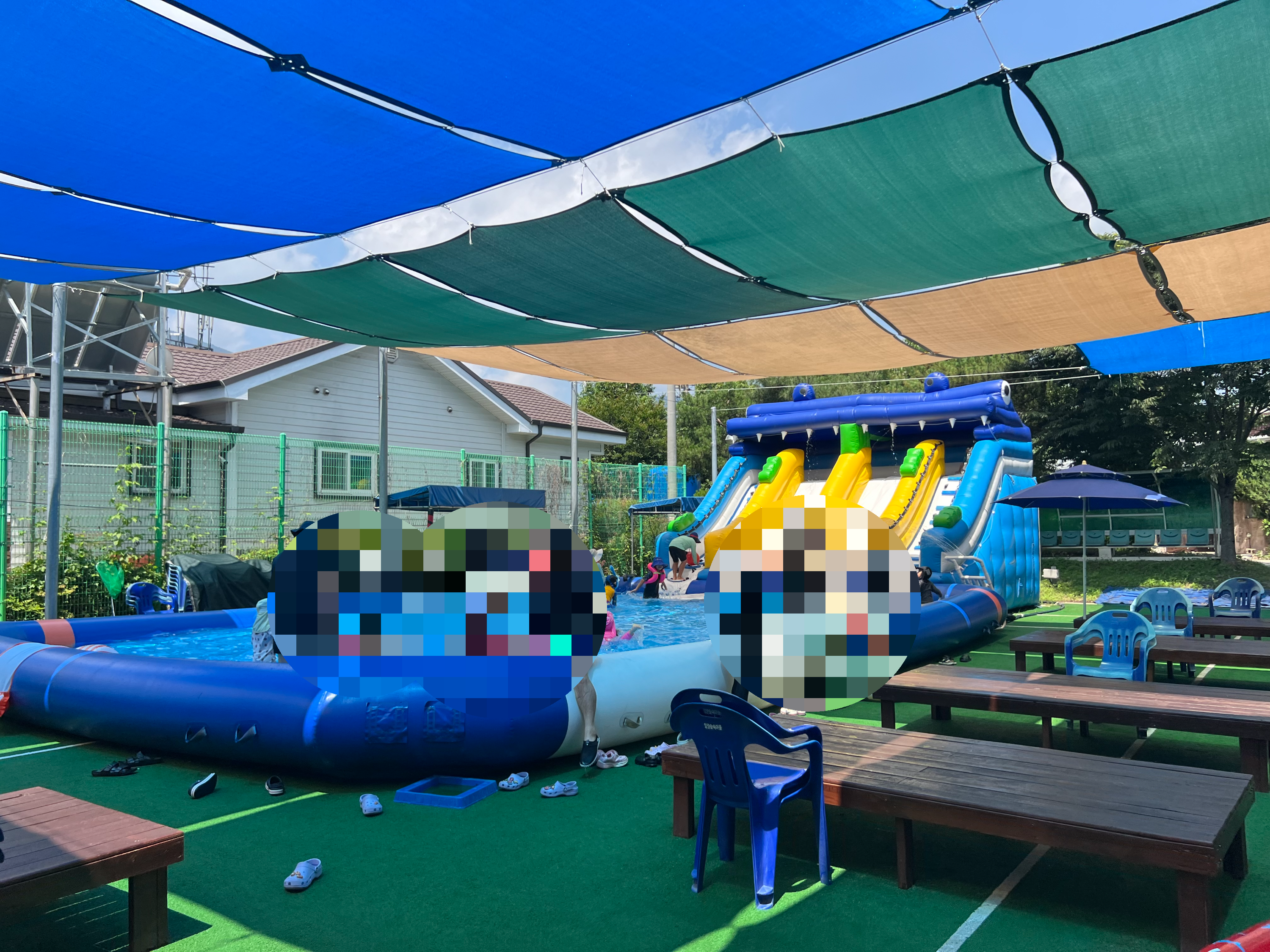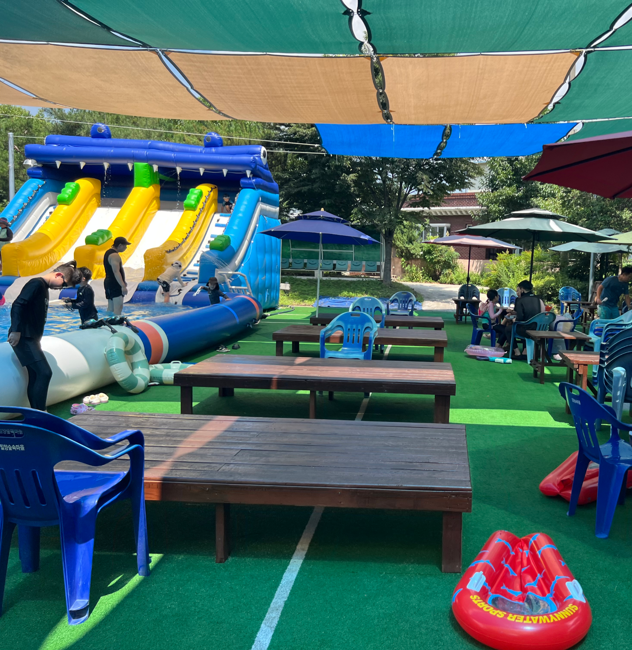 물놀이장 옆 공터에는 초등학생 저학년도 즐길 수 있는 에어바운스 수영장이 있어 형제·자매가 나이 차이가 있어도 함께 이용 가능해요.