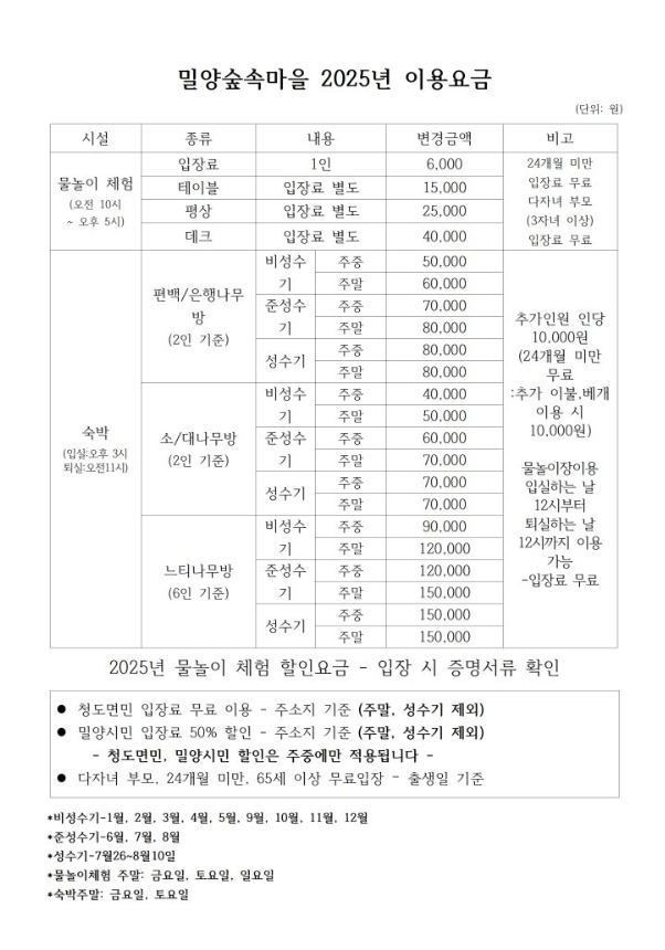 ✅ 청도면 주민 무료, 밀양시민 50% 할인 (단, 주말/성수기 제외)
