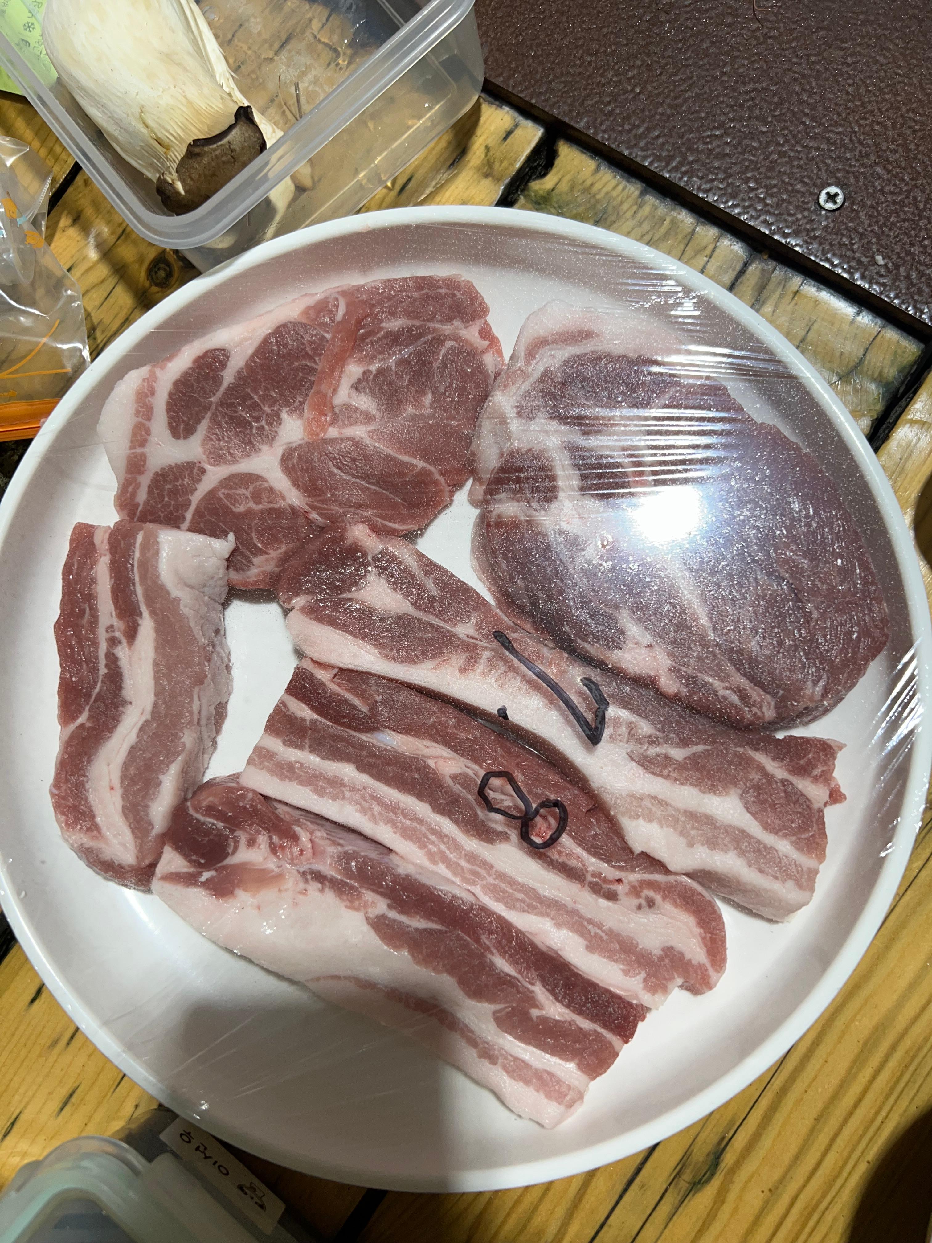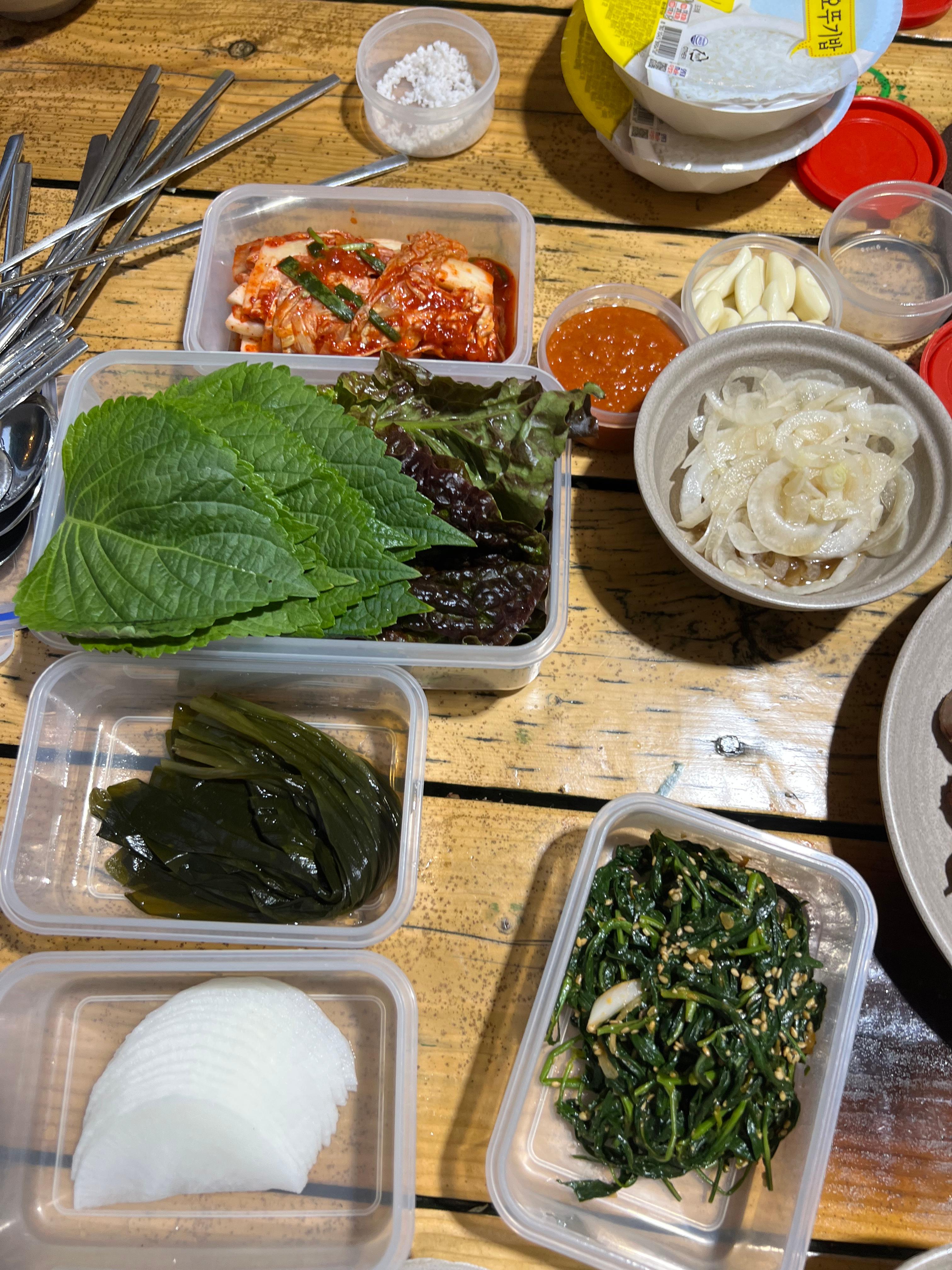 - 메뉴 구성: 국내산 암돼지 목살 및 삼겹살 400g (2인 기준), 햄, 소시지, 새우, 새송이버섯, 햇반, 생수, 상추, 깻잎, 김치, 양파, 양파소스, 명이나물, 쌈무, 마늘, 소금, 쌈장 등