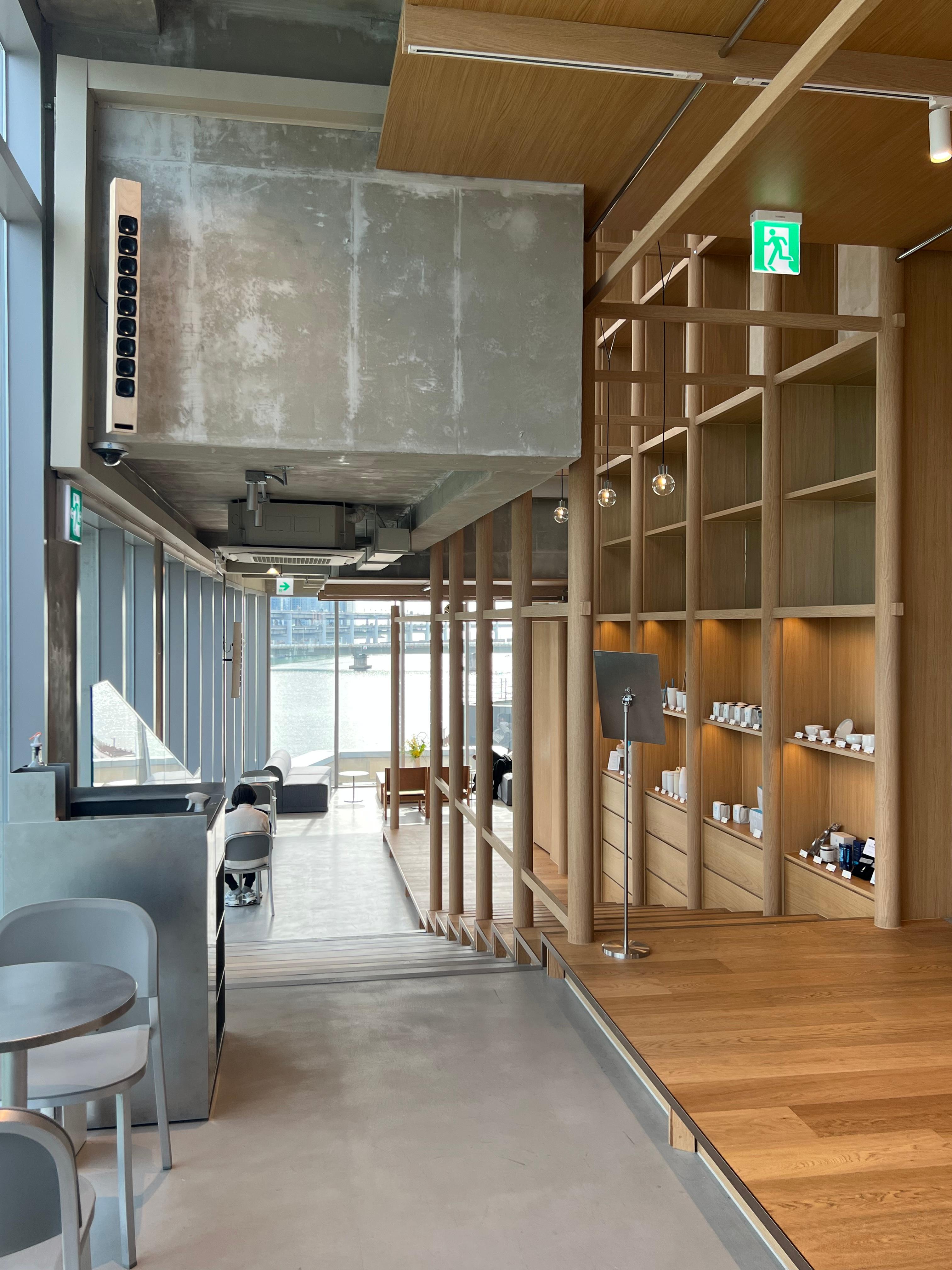 매장은 블루보틀 특유의 미니멀하고 깔끔한 감성이 살아 있다. 통유리로 되어 있어 수영강을 보며 커피를 즐길 수 있는 최고의 뷰를 자랑한다.