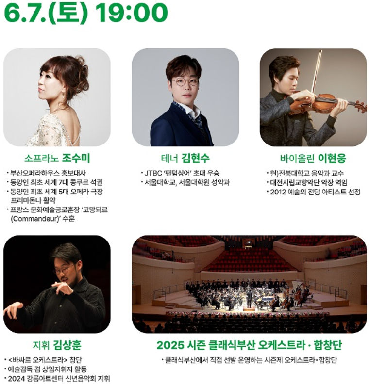 - 출연: 소프라노 조수미, 테너 김현수, 바이올리니스트 이현웅, 클래식부산 오케스트라 및 합창단