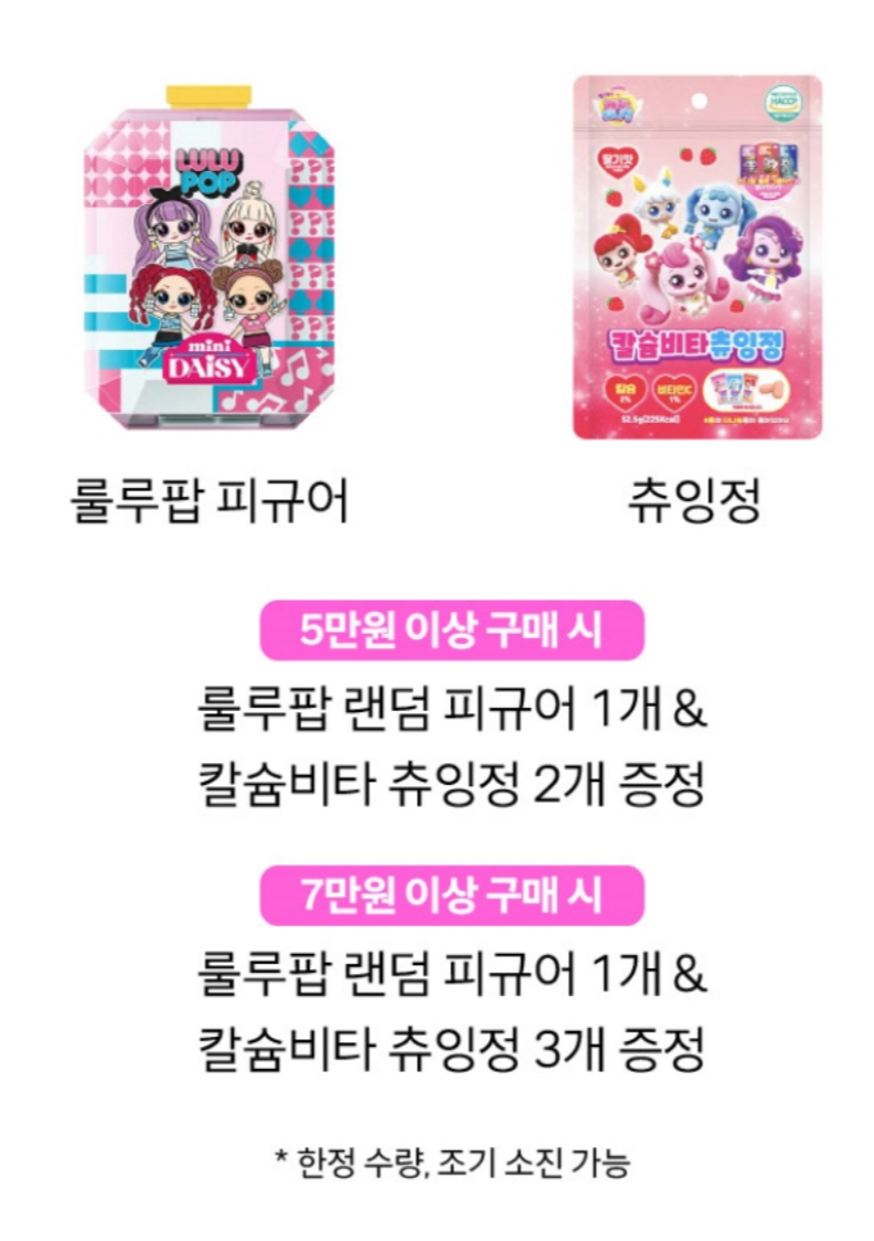 - 7만 원 이상 구매 시: 룰루팝 프린세스 인형 + 티니핑 칼슘비타츄잉 등 풍성한 추가 선물