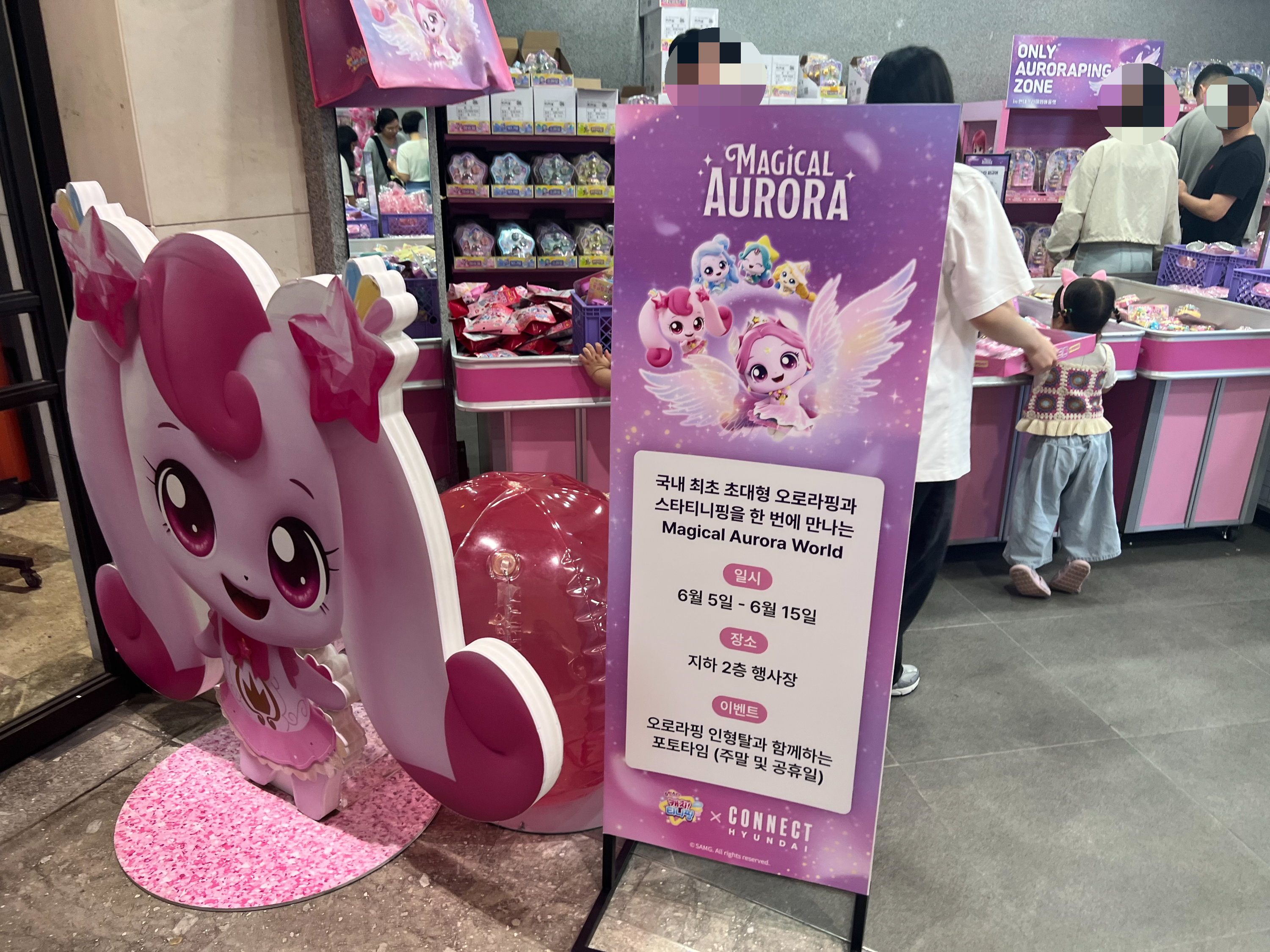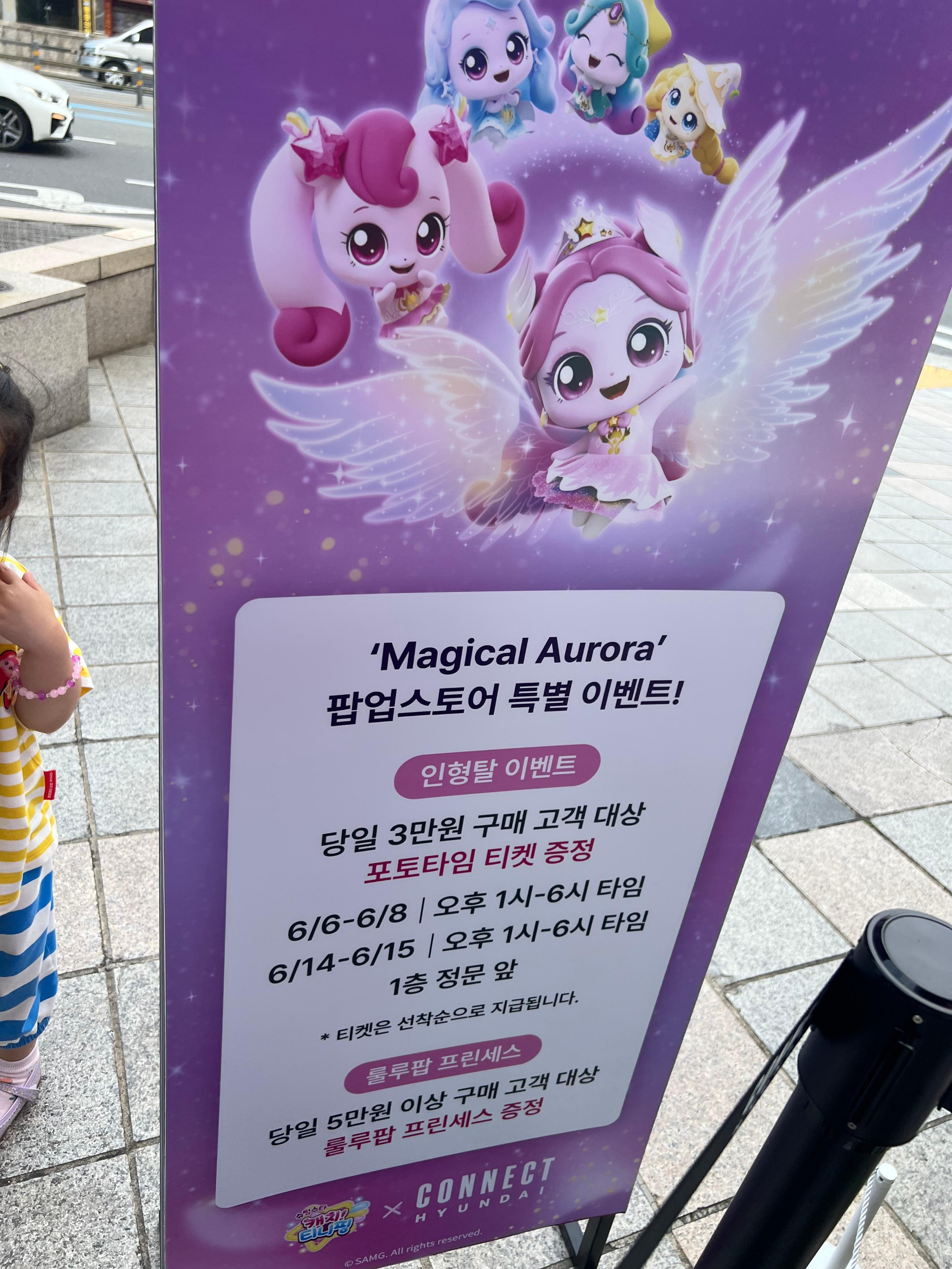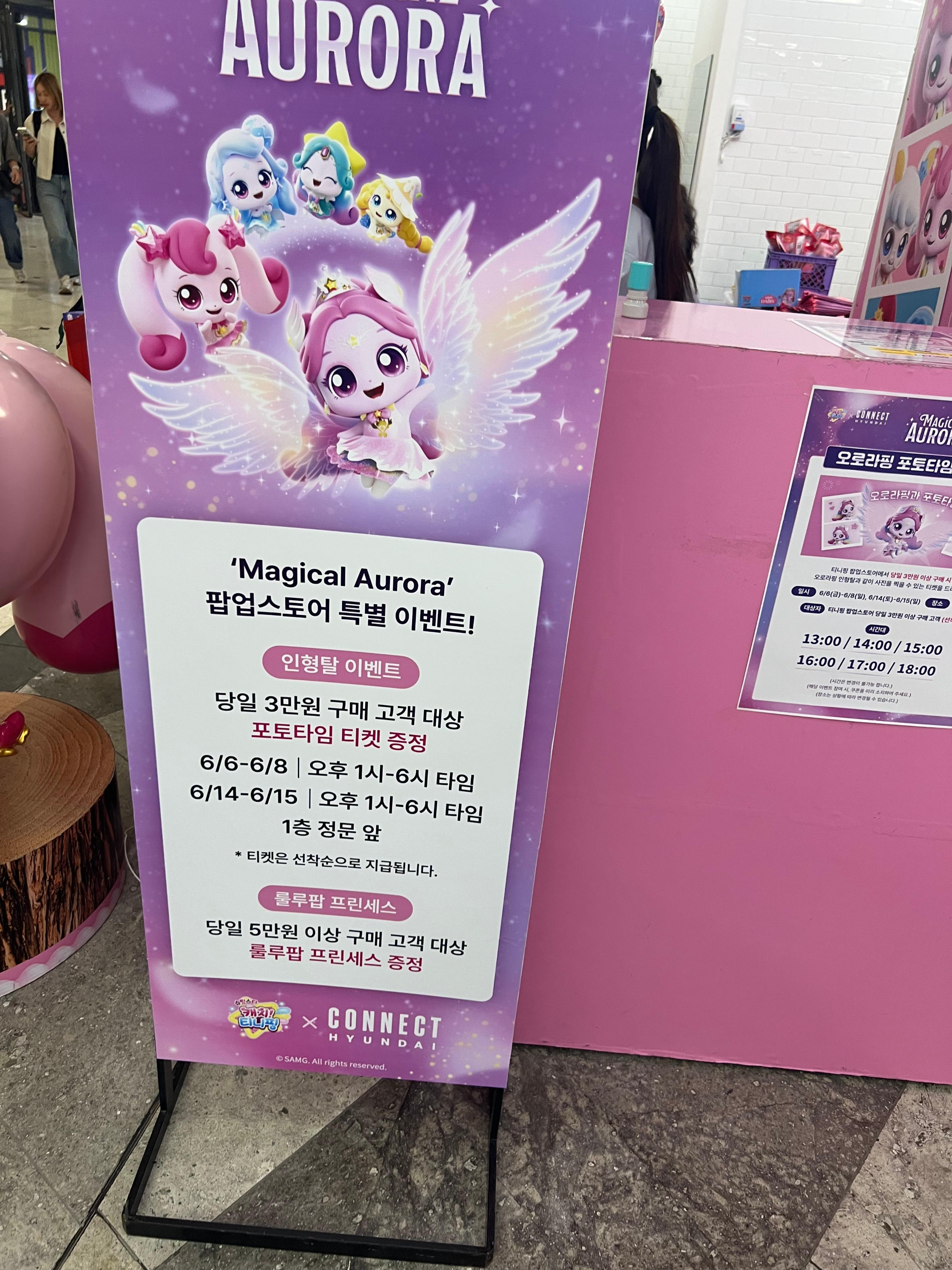 부산 지하철 1호선 범일역 7번 출구 앞, 커넥트 현대 부산에서 한시적으로 펼쳐진 Magical Aurora 팝업 스토어에서는 ‘슈팅스타 티니핑’의 레전드 캐릭터 오로라핑을 실제로 만날 수 있습니다. 아이들은 인형탈 오로라핑과의 포토타임, 어르신들은 귀여운 굿즈 쇼핑, 부모님들은 편리한 위치 덕분에 모두 함께 즐기기 딱이죠! 지금부터 부산 커넥트현대 티니핑 팝업스토어에 대해서 자세하게 알려드리도록 하겠습니다. 꿀팁들이 있으니 끝까지 읽어주세요:)