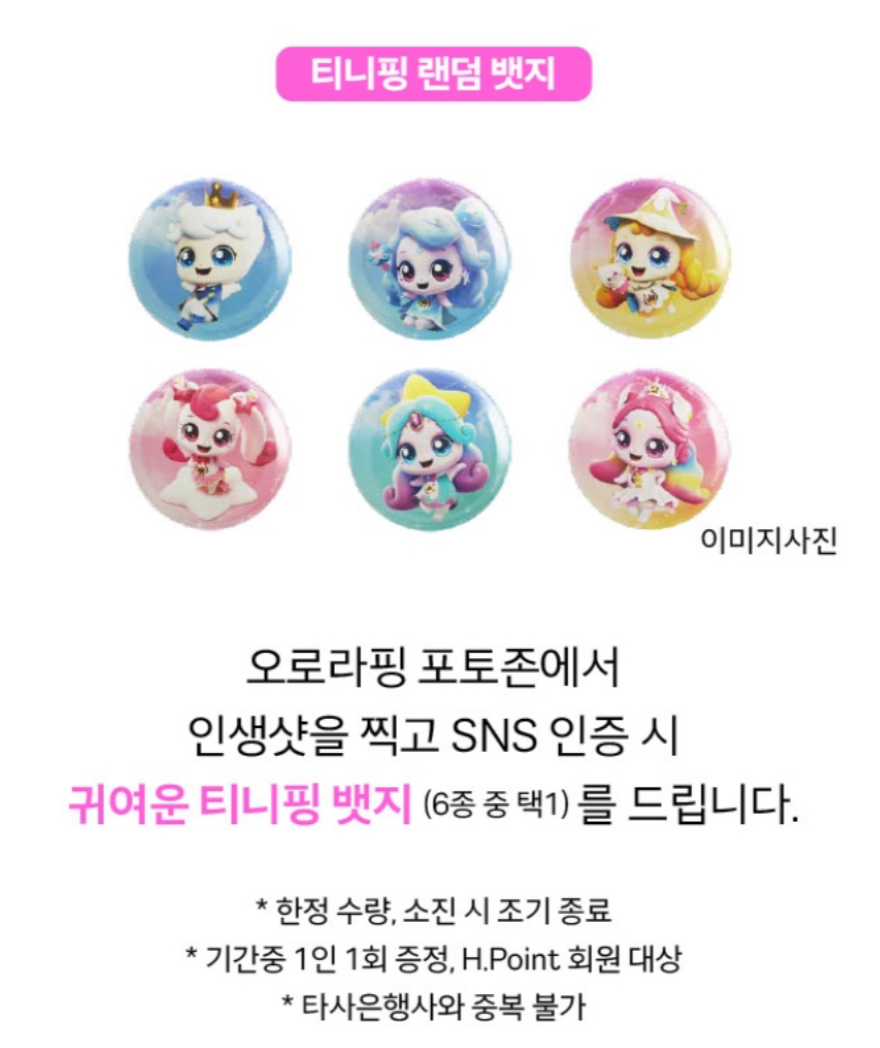 - 랜덤 뱃지 증정: 오로라핑 포토존에서 인생샷 찍고 ,SNS인증시 귀여운 티니핑 뱃지 증정