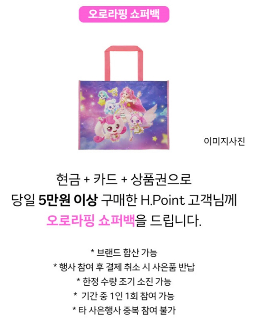 - 5만 원 이상 구매 시: 한정판 오로라핑 쇼퍼백 증정