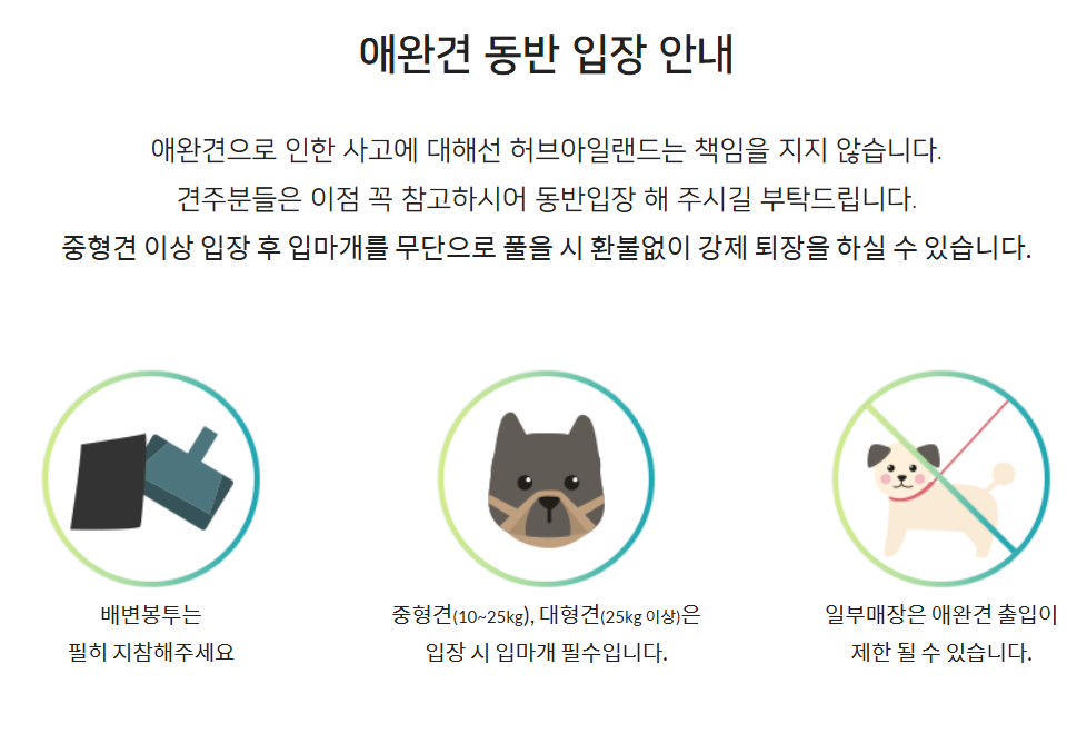 - 반려견 동반으로 인한 사고에 대해서는 허브아일랜드 측이 책임지지 않으므로, 견주는 각별한 주의가 필요합니다.