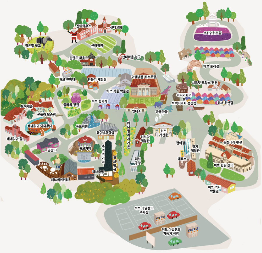 | 가족코스 (Family) | 허브식물박물관 → 동물농장 → 불빛동화마을 → 미니허브정원 → 허브레스토랑 → 허브빵집 |
