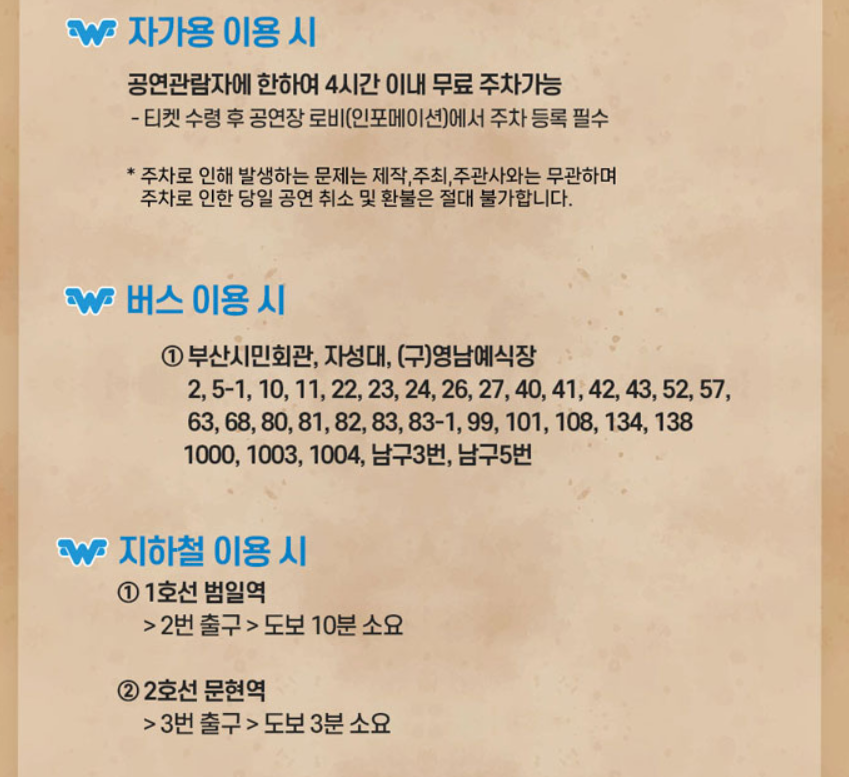 - 주차: 공연장 내 주차장 이용 가능하며, 공연관람시 4시간 무료, 주차 할인권 적용 시 추가 요금이 발생할 수 있습니다.