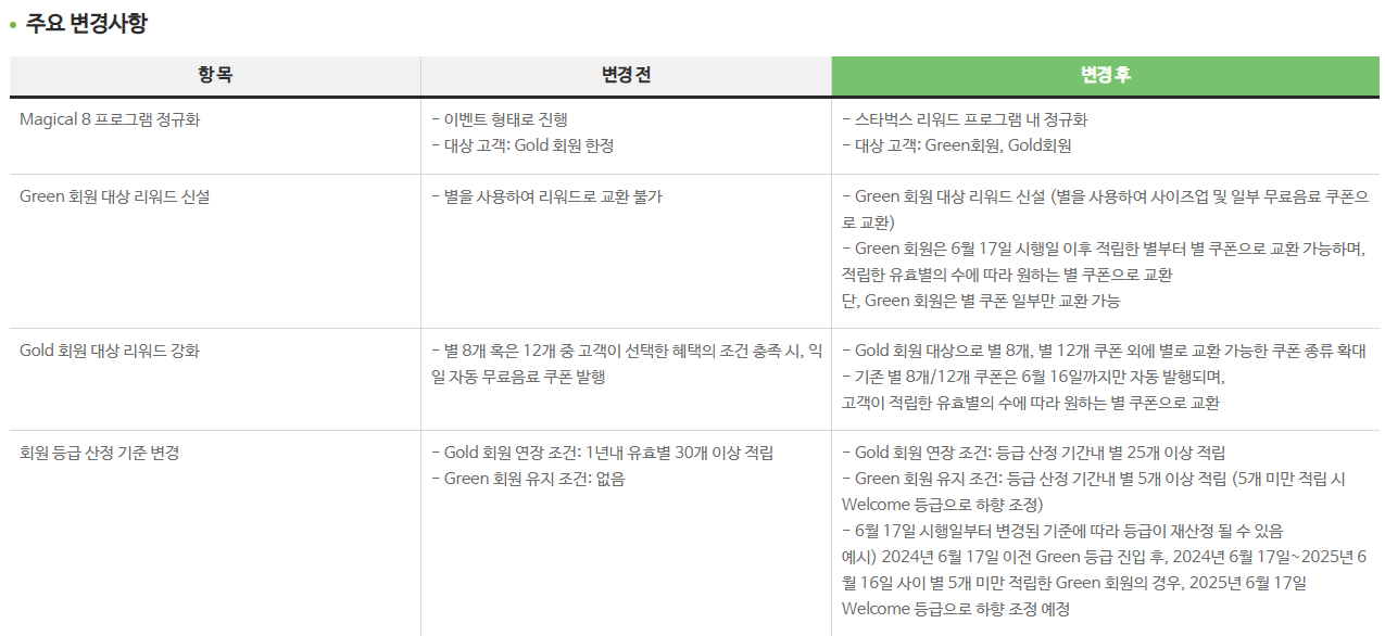 | Green | 별 5개 이상 적립 | 별 5개 이상 유지 시 유지 | 별 8개: 아메리카노 무료쿠폰, 별 2개: 사이즈업 |