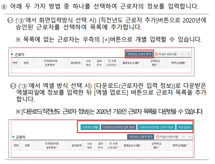 | 근로자 입력 방법 | 화면 직접 입력 또는 엑셀 업로드 | 기승인 근로자 선택 또는 엑셀 업로드 |
