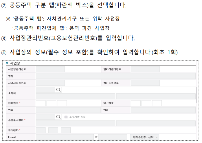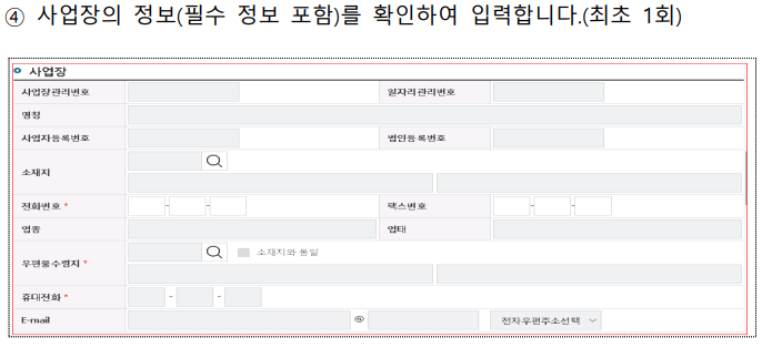 | 사업장 정보 입력 | 최초 1회 필수 입력 | 최초 1회 필수 입력 |