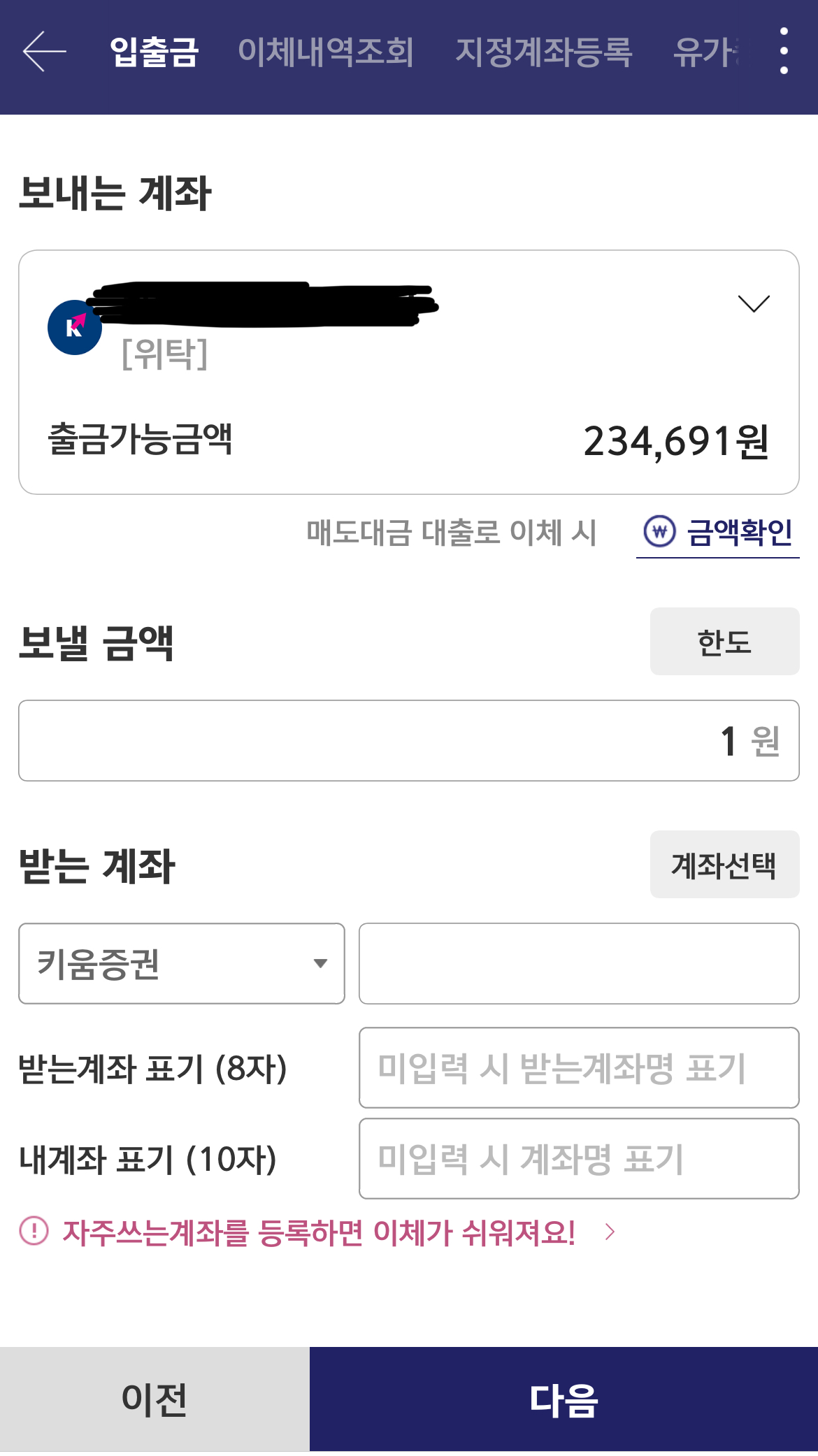 - 해외증권 계좌를 선택하거나, 1원 출금 방식으로 등록하면 됩니다.