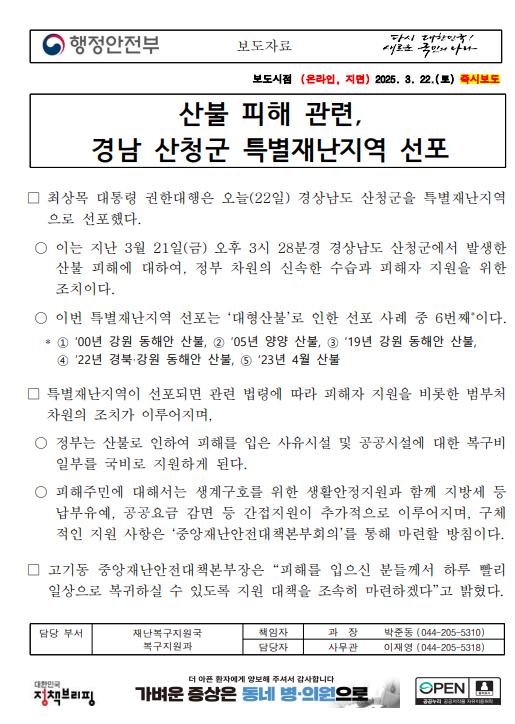 2025년 3월, 경남 산청에서 발생한 대형 산불로 인해 산림청은 해당 지역을 특별재난지역으로 지정했습니다. 갑작스러운 재난으로 삶의 터전을 잃은 주민들에게 지금 가장 필요한 것은 빠른 회복과 현실적인 지원입니다.
