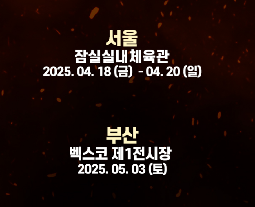 | 부산 | 5월 3일(토) | 오후 1시 / 6시 | 벡스코 제1전시장 1홀 | 부산 해운대구 APEC로 55 |