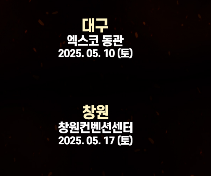 | 대구 | 5월 10일(토) | 오후 1시 / 6시 | 대구 엑스코 동관 | 대구 북구 엑스코로 10 |
