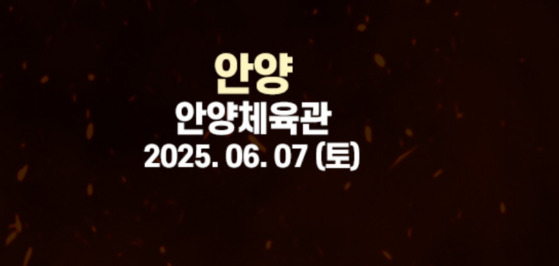 | 안양 | 6월 7일(토) | 오후 1시 / 6시 | 안양체육관 | 안양시 동안구 평촌대로 389 |