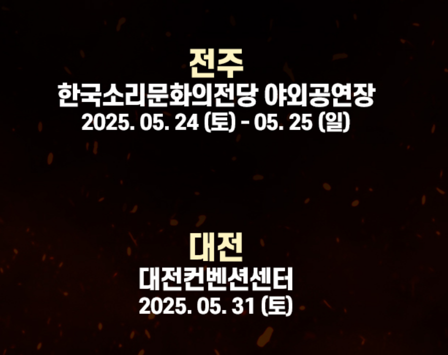 | 대전 | 5월 31일(토) | 오후 1시 / 6시 | 대전컨벤션센터 제2전시장 | 대전 유성구 엑스포로 107 |