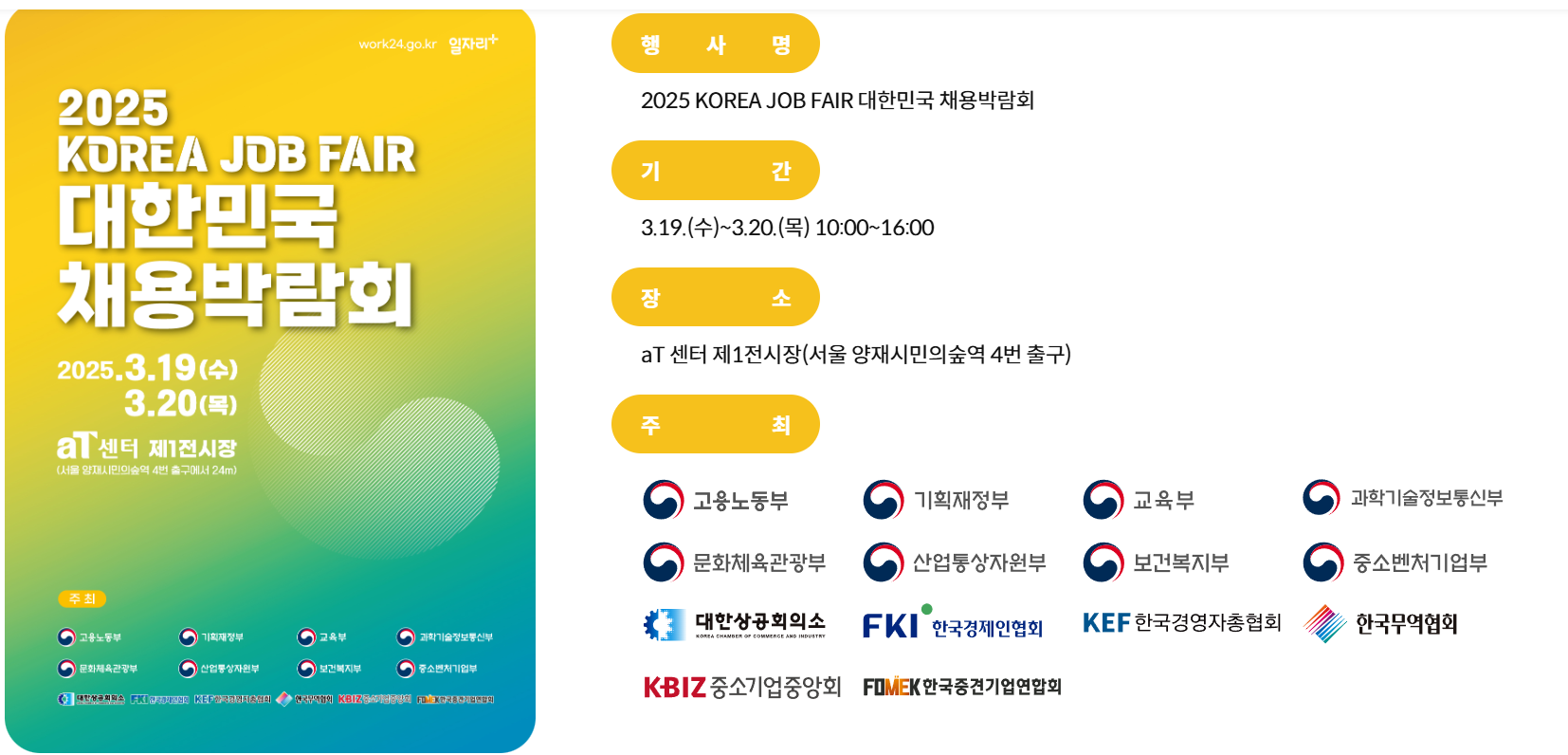 ◆ 주최: 고용노동부, 기획재정부, 교육부, 과학기술정보통신부, 문화체육관광부, 산업통상자원부, 보건복지부, 중소벤처기업부, 대한상공회의소, 중소기업중앙회, 한국무역협회, 중견기업연합회, 한국경영자총협회