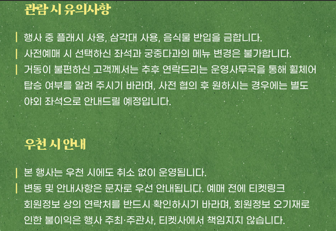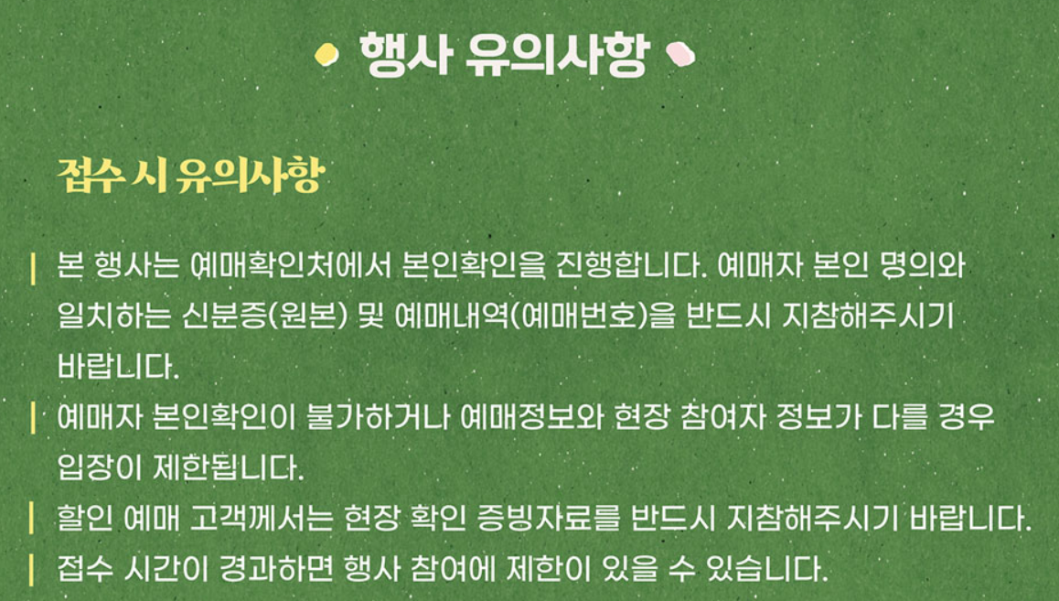 - 입장 시: 신분증과 예매 내역 필수 지참
