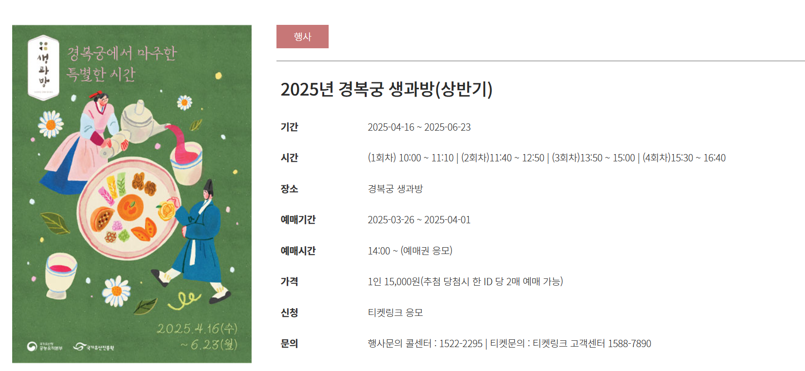 왕의 후식이 현대에 되살아나는 특별한 공간, 경복궁 생과방이 2025년 봄 다시 찾아옵니다. 고즈넉한 경복궁 안에서 궁중병과와 궁중약차를 직접 맛볼 수 있는 이 체험은 매년 빠르게 매진될 만큼 인기 있는 전통문화 체험으로, 이번 상반기 일정과 예약 정보를 미리 확인하고 준비하시면 좋습니다.