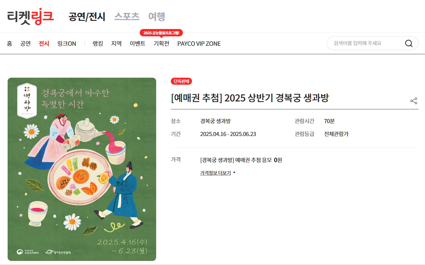 봄날 경복궁에서 조용한 궁중 다과 한 상을 즐기며 과거로의 시간 여행을 떠나보세요. 예매 응모는 빠르게 마감되니, 지금 바로 티켓링크에서 신청해보시길 바랍니다!