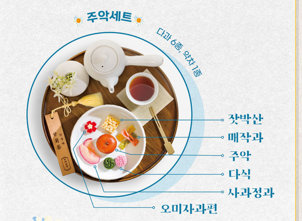 - 주악세트: 찹쌀 주악, 곶감단지, 금귤정과, 쌀엿강정, 매작과 등
