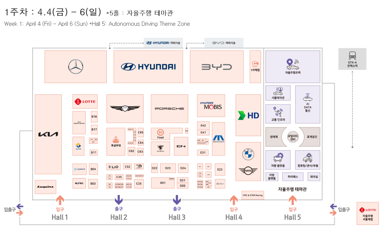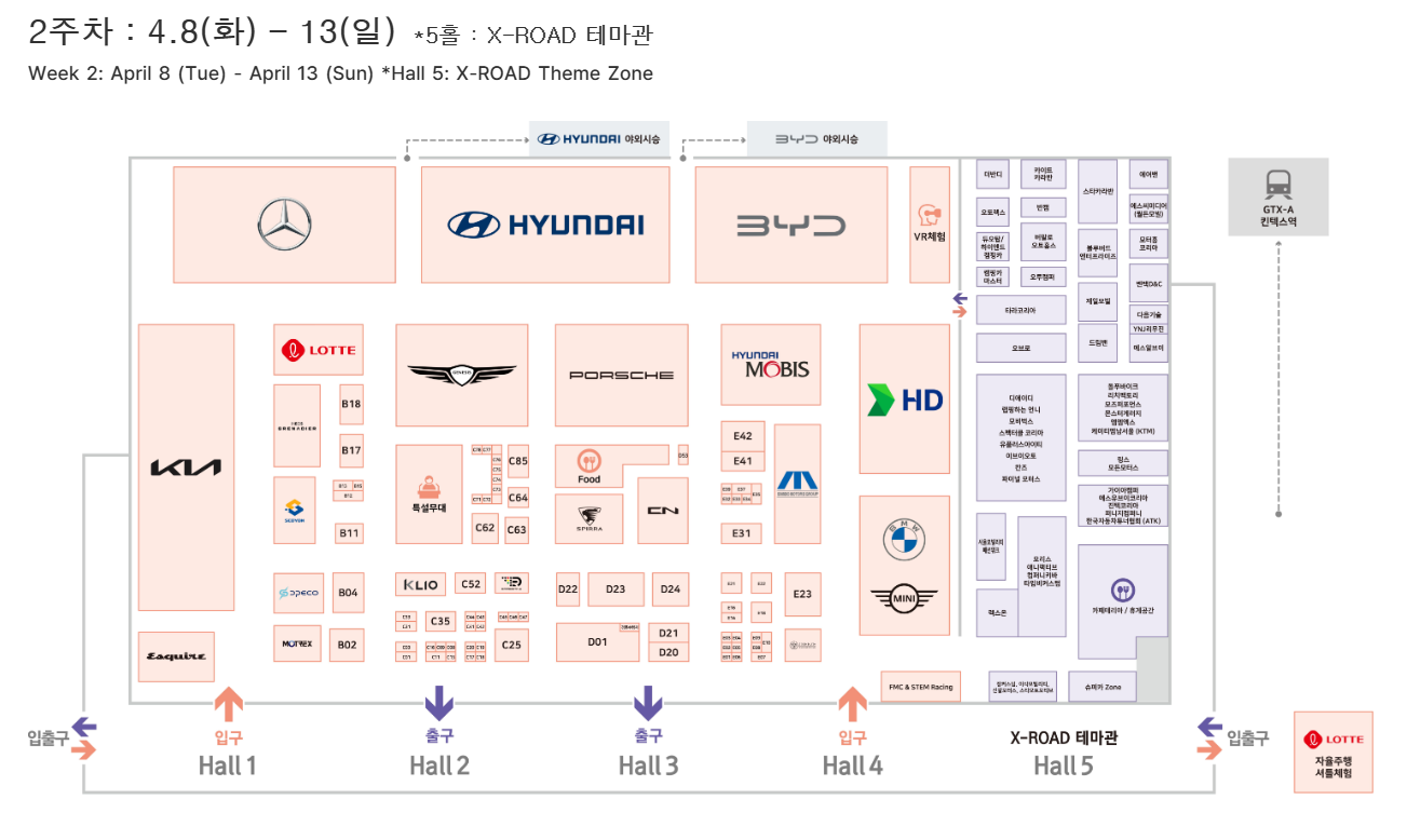 | 2주차 | 4월 8일(화) ~ 13일(일) | X-ROAD 테마관 (스타트업, 튜닝카, 미래기술 기업 전시) |