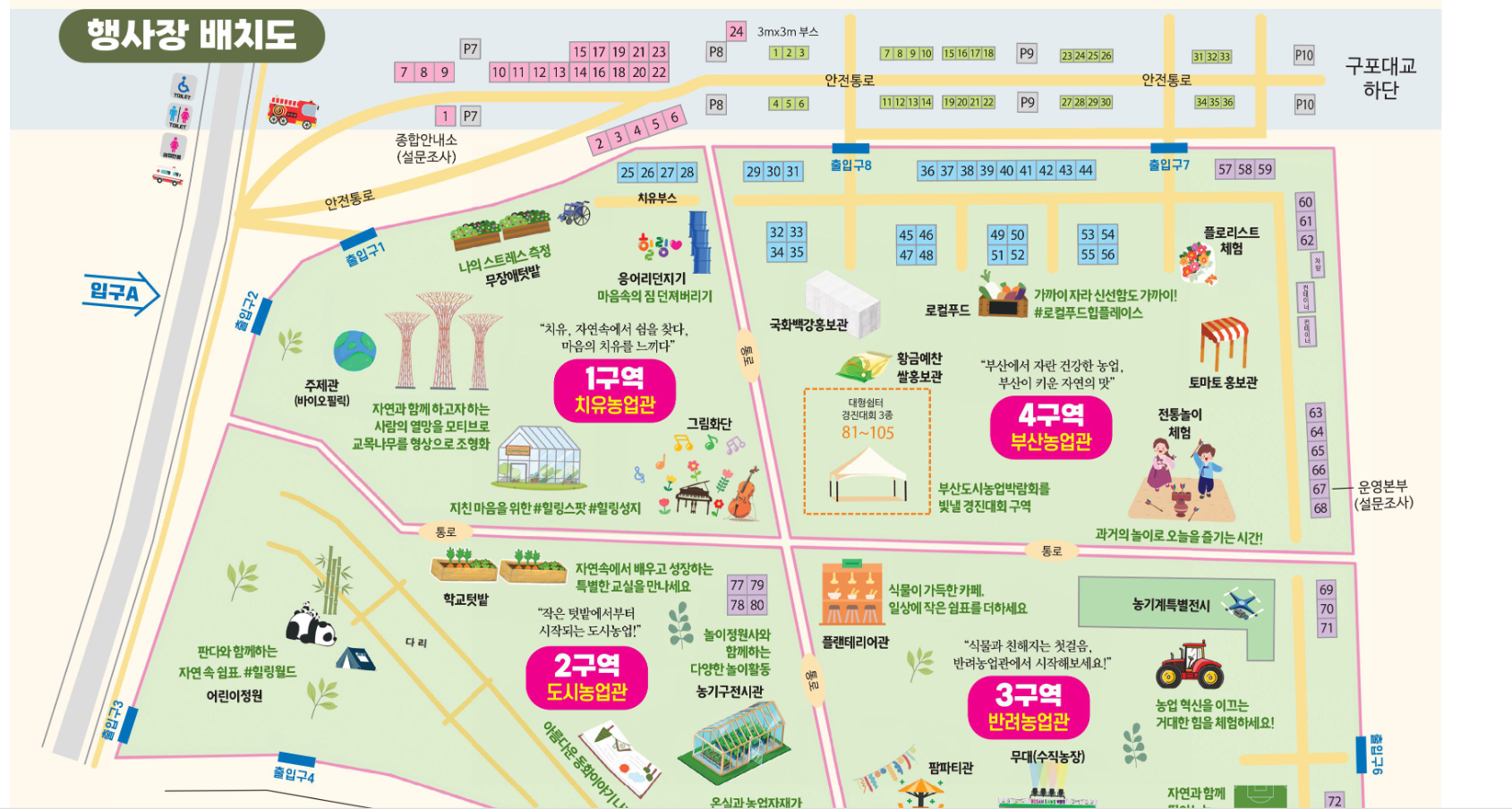 - 4구역: 부산농업관 – 로컬푸드 전시, 전통놀이, 토마토 체험 등