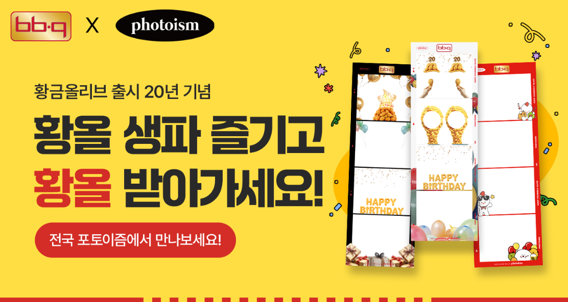 BBQ는 MZ세대에게 인기 있는 셀프 스튜디오 '포토이즘'과 협업하여 황금올리브 치킨 20주년을 기념하는 생일 축하 프레임을 제공합니다. 포토이즘을 방문하면 특별한 프레임으로 추억을 남길 수 있어 젊은 고객층의 큰 호응이 예상됩니다.